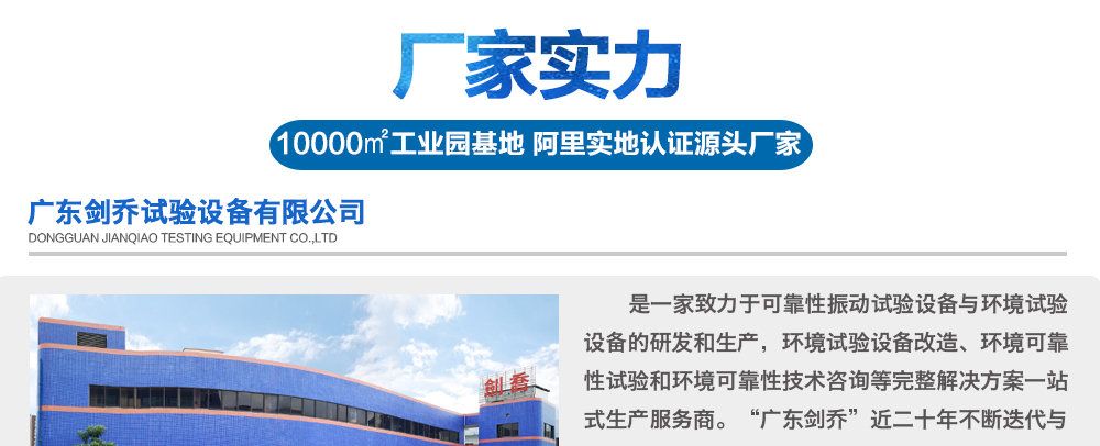 您好!歡迎光臨廣東劍喬試驗設備有限公司!主營產品:振動臺、振動試驗臺、高頻振動臺、振動試驗機、沖擊試驗臺、三綜合環境試驗箱、冷熱沖擊試驗箱等設備!